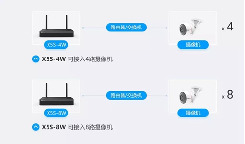 X5S支持一键接入多组互联网摄像机,最高可连8路高清摄像机。快捷的无线接入方式,免去布线成本,使得摄像机能够更加灵活地部署在所需的点位,大幅提升了监控系统的整体应用价值。
