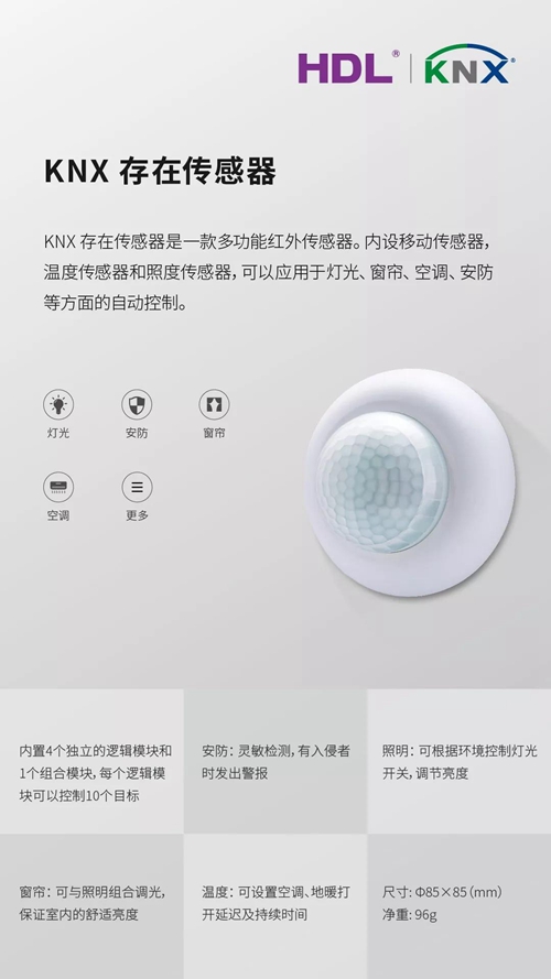 传感器就像我们的五官一样,可以帮助我们获取外部世界的信息。HDL新发布的KNX 存在传感器是一款多功能红外传感器。内设移动传感器,温度传感器和照度传感器,可以应用于灯光、窗帘、空调、安防等方面的自动控制。我们关注产品在实际应用中遇到的各种问题,在生命周期中持续改进产品。