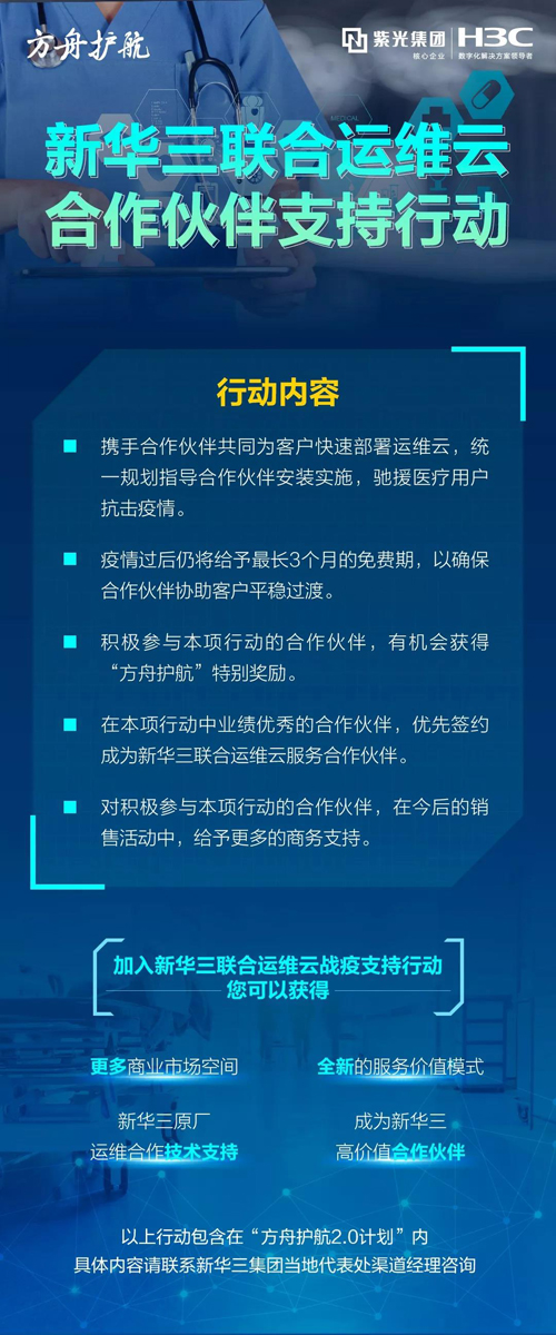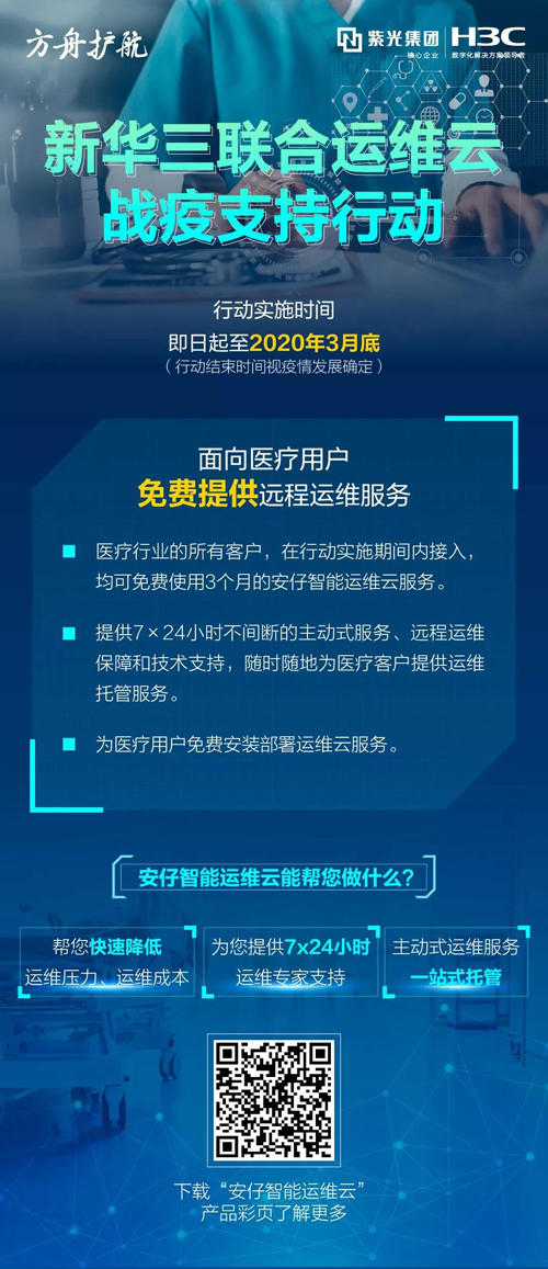 疫情期间,全国各地医院积极开展疫情防控工作,对于医疗业务的连续性、稳定性也提出更高的要求。为更好地支持保障医疗业务稳定运行,紫光旗下新华三集团现推出“联合运维云战疫支持行动”,为医疗客户免费安装部署运维云,携手合作伙伴,鼎力支持医疗客户疫情防控工作顺利开展!