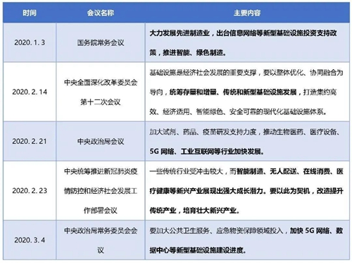 近日来,国家陆续出台了“新基建”相关政策(如表1),社会上的关注度也在不断增加,引发广泛讨论。“新基建”是相对于“铁公机”等传统基础设施而言的新型信息网络建设,主要涉及:5G基础设施、特高压、城际高铁和轨道交通、新能源汽车充电桩、大数据中心、人工智能和工业互联网七个领域。“新基建”三个字蕴含着无限发展的可能性。据央广网报道,目前在新冠肺炎疫情冲击和经济下行压力下,各省市已上报近25万亿元的基建计划,其中很大一部分资金建设在新经济领域,资源向新技术产业倾斜。