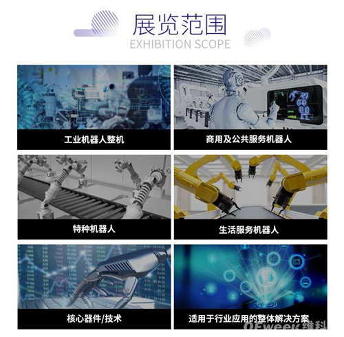 展出范围:协作机器人、焊接机器人、喷涂机器人、码垛机器人、搬运机器人、装配机器人、激光加工机器人、真空机器人、洁净机器人、打磨抛光机器人、多关节机器人、SCARA机器人、Delta机器人、直角坐标型机器人、其他工业机器人等;