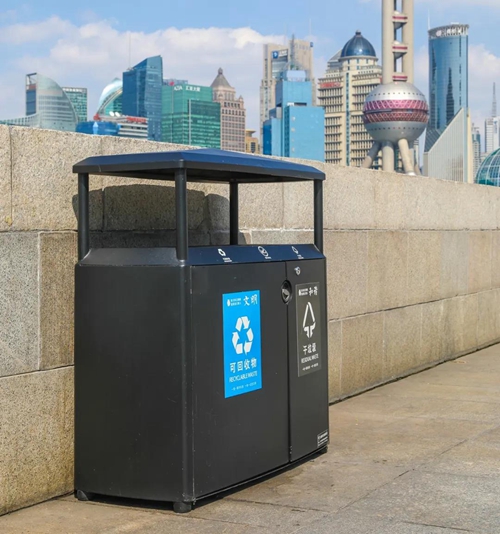 垃圾箱自带语音提示功能,提醒垃圾分类,从源头上解决原先摆摊带来的脏乱差问题。
