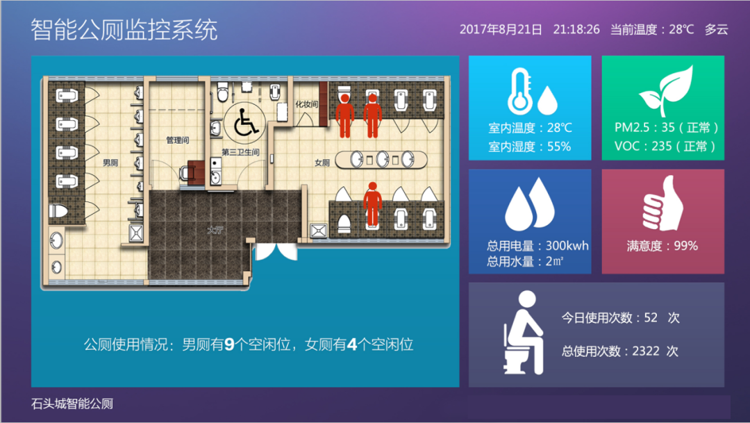 石头城智慧公厕监控系统图,通过公厕安装的各种空气质量监测装置将具体数据反映到大屏上,另外还有蹲位引导图方便游客合理利用时间。