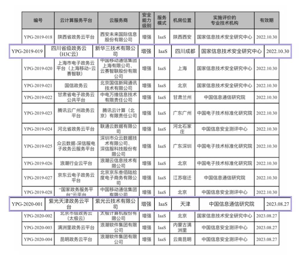 近日,中央网信办正式发布通过国家云计算服务安全评估的云平台名单,由紫光云与智能事业群企业——新华三集团、紫光云技术有限公司主力承建的四川省级政务云、紫光天津政务云平台均已通过国家云计算服务安全评估,获得相应资质认证。