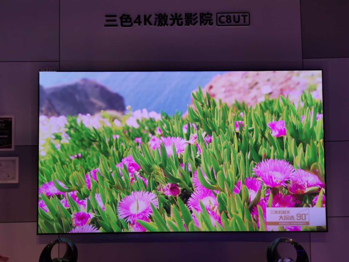 长虹在2018年全球首发三色4K激光电视,在市场中广受赞誉,发声屏、全面屏和柔性屏等产品渠道全覆盖。2019年新一代激光电视正式上市。在本次展会上,长虹主要带来三色4K激光影院,特点是RGB三色激光、220%超高色域、原色画质和AI物联,在人眼检测和保护上,自动甄别保护、多屏协同和语音控制,从而提供智能化服务。