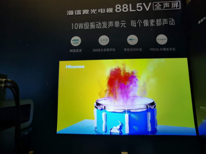 激光电视是海信重点产品之一,本次展会海信展示了88L5V全声屏激光电视,采用10万级振动发声单元,让每个像素都在振动,360度全屏幕声场带来极致视听体验,4K超高清屏幕带来强烈观感。