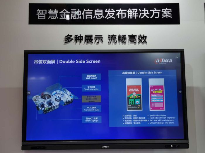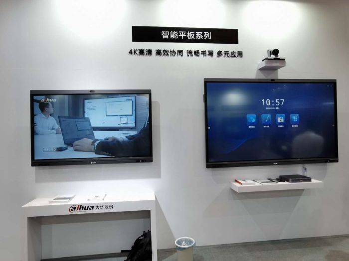 大华展示了智慧金融信息发布解决方案,给客户展示多种交互方式,带来流畅高效的用户体验。同时大华也带来了智能平板系列产品,在4K高清、高效协同和多元应用等多方面,服务于广大客户。