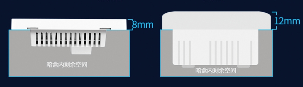 Ap面板嵌入墙体后,突出仅有8mm,与其他的房内开关面板的厚度保持一致,即便与插座、开关联排安装也不会造成突兀。