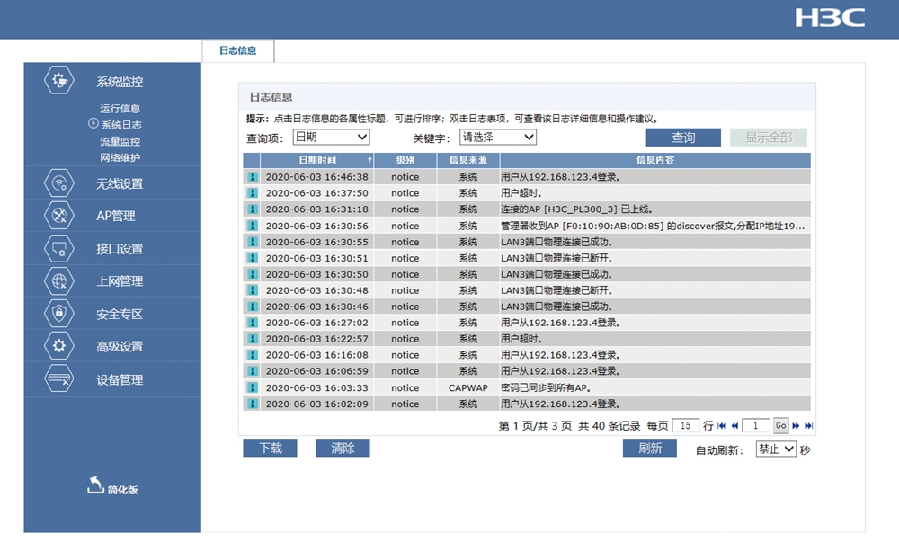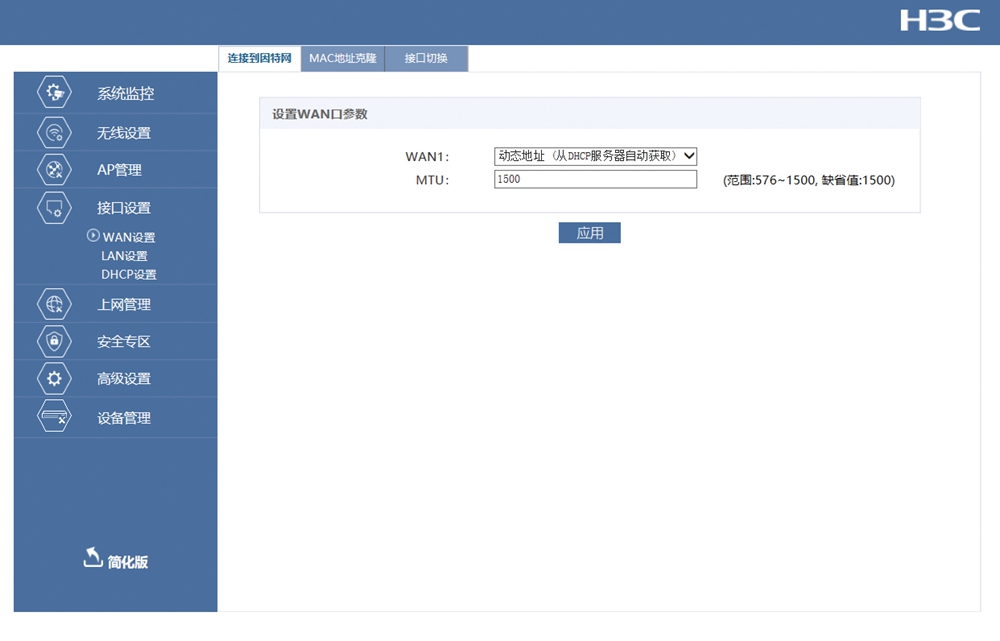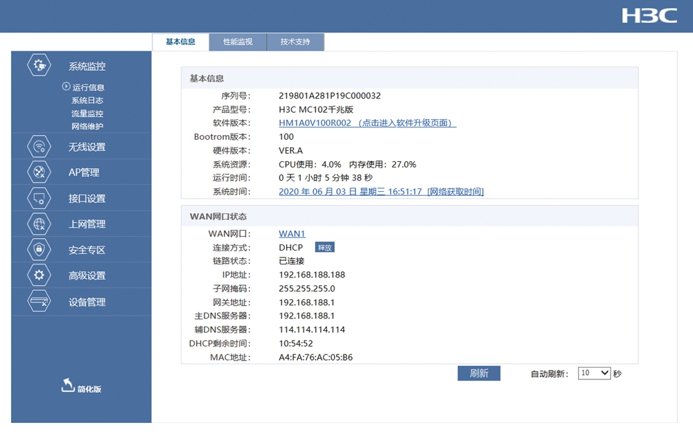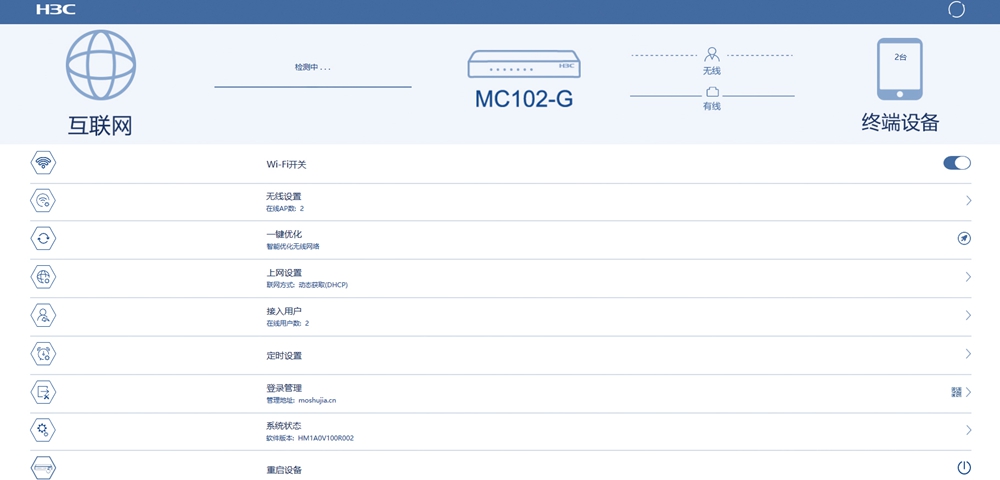 新华三网络套装,依然采用IP地址+浏览器这种B/S模式登录WEB管理界面,可以在浏览器的地址栏输入http://192.168.123.1或http://moshujia.com即可进入登陆界面,默认账号密码登陆后进入全中文后台管理界面。