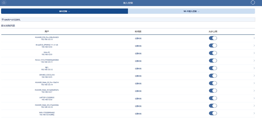 所有接入到AP的设备,后台都可以清晰看到,并且管理每个设备的访问权限。跑满流量状态下,每个AP的带机量可以达到50-80台设备。如果仅仅是智能家居设备,如智能门锁、智能电饭煲、智能空调的短链接,其连接数可以大大超过推荐数值,非常适合智能家居的重度用户。