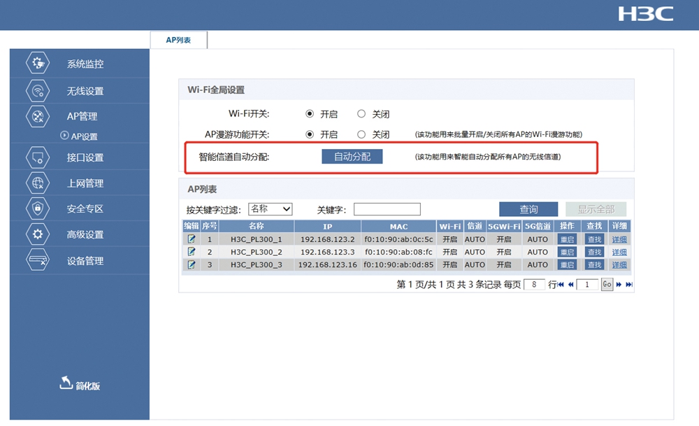 为何说这款新华三AC+AP的分布式网络套装比较智能,因为具备AP自动发现、发射功率调整、信道调整、地址分配、软件升级、配置同步、断线检测、信息显示等各种功能,都可以轻松管控。