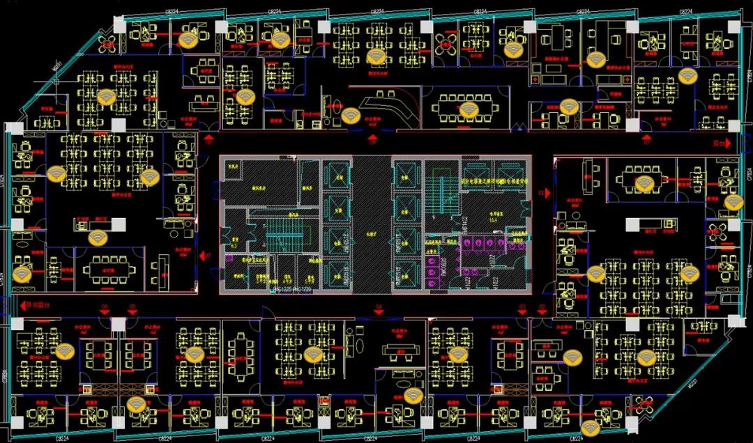 4F与5F总面积共计4000平方米,4F和5F都使用了最新的Wi-Fi 6 AP——AP1000C Plus6,各部署28台,分别部署在如图所示的各个重点用网区域。