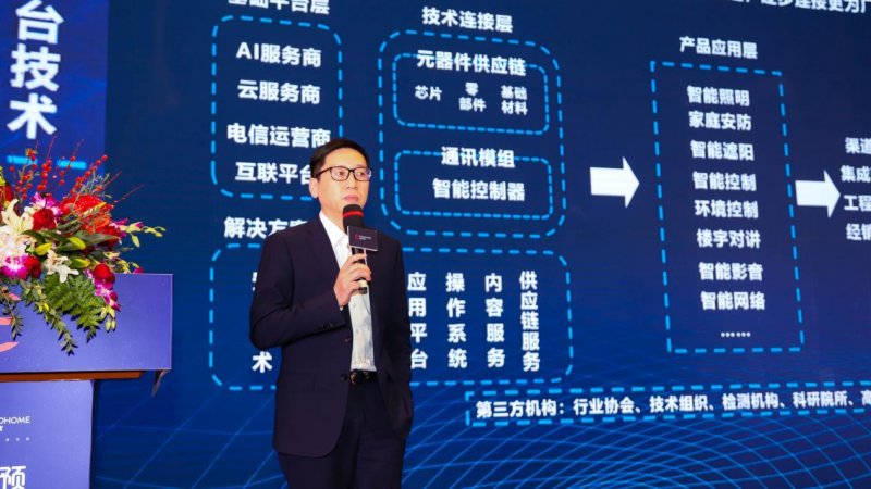 周军先生发表了《泛连接时代的智能家居价值链重构》主题演讲。周军秘书长表示:泛连接时代,技术应用走向成熟,将推进更大范畴的设备互联。大家居行业走向整装化、场景化和智能化,推动产业价值链的重构。