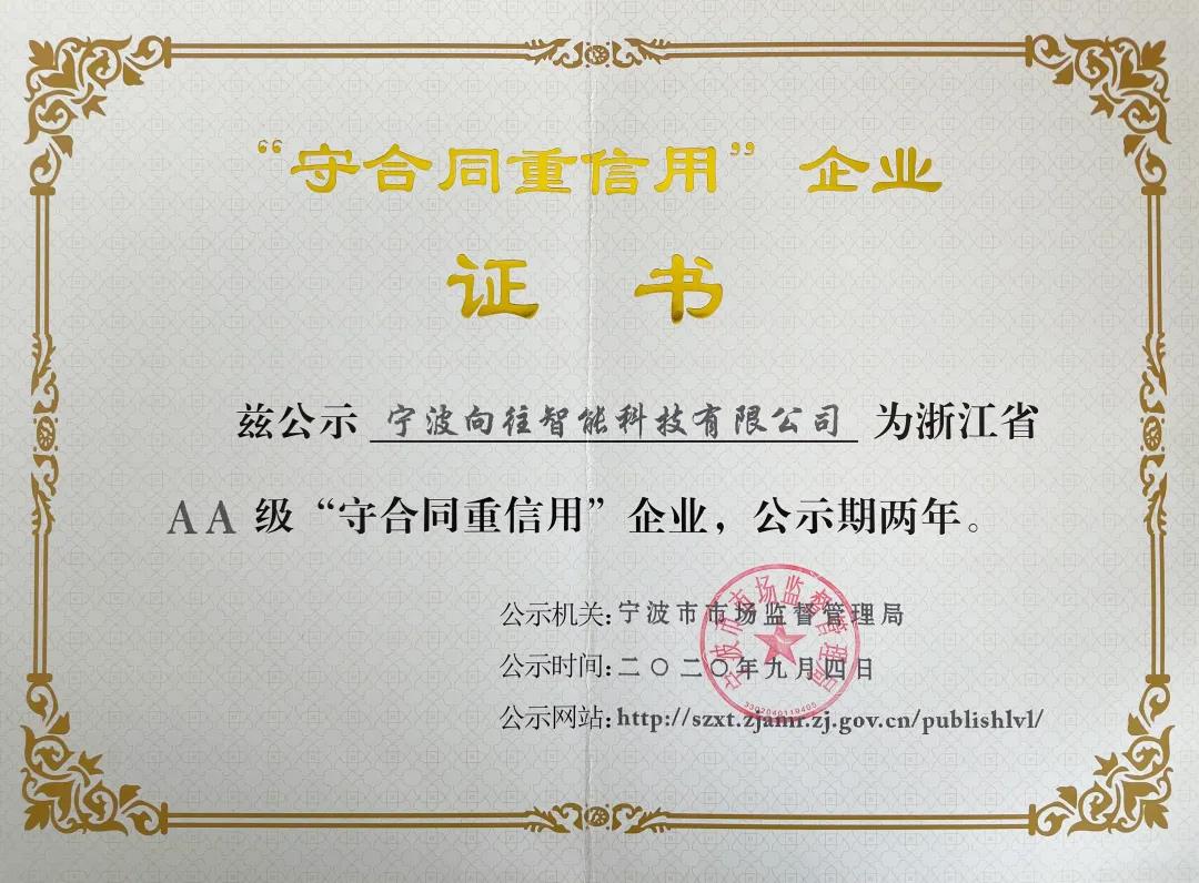 近期,2020 年浙江省 “守合同重信用”企业名单公布,宁波向往智能科技有限公司荣获浙江省AA级“守合同重信用”企业。