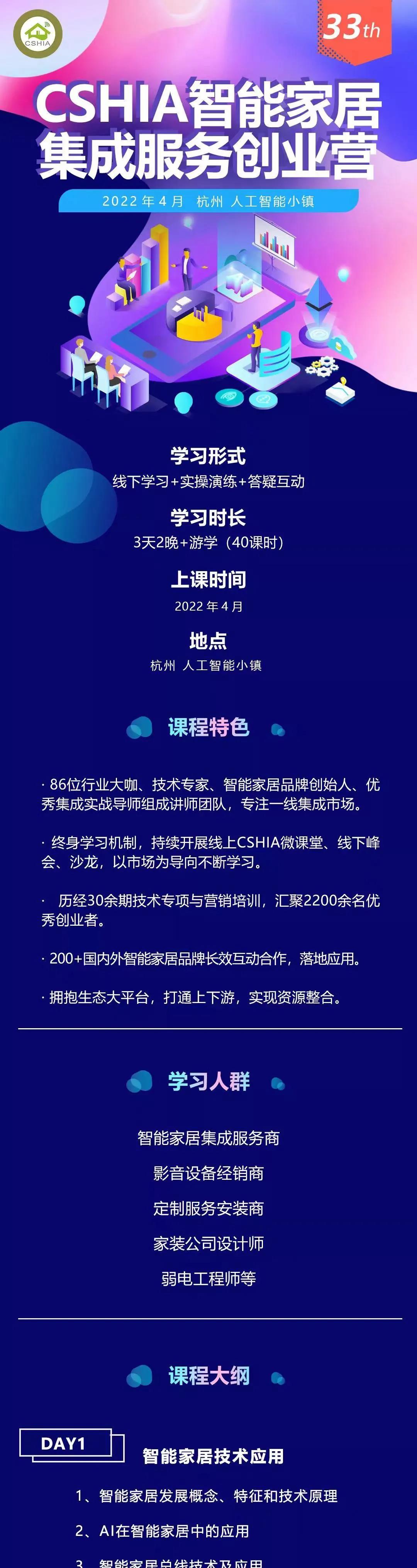 2022年4月,第三十三期CSHIA智能家居集成服务创业营招生正在火热进行中,通过几天系统性的学习,让大家掌握到智能家居的核心知识体系、实战技巧、项目管理经验等,结识到来自全国各地的行业伙伴。我们诚邀您成长升级!!!