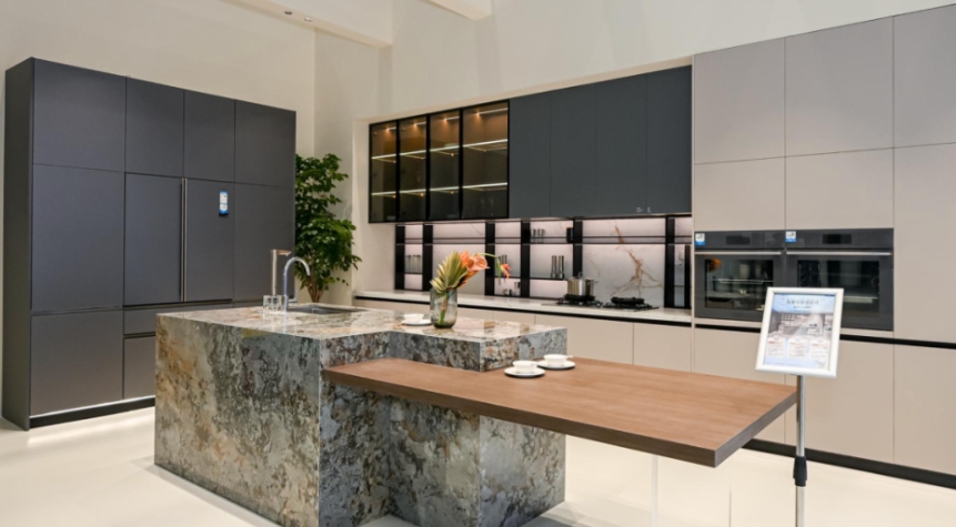 走进三翼鸟厨房,最先感受到的就是“这不就是小红书上的‘网红模板’!”开放式的空间设计没有了阻隔,可以更好地与家人互动聊天。冰箱和橱柜就像“孪生兄弟”,同质同源浑然天成,纯黑的烤箱、蒸箱、洗碗机隐于橱柜,面面齐平极度舒适。不仅视觉享受,功能性也很强大。你看这款洗碗机,它可不是只能洗碗这么简单,轻轻一敲,抽屉自动打开,不用弯腰就能拿去碗筷,而且更绝的是它还能联动拉篮,收纳起来更方便。