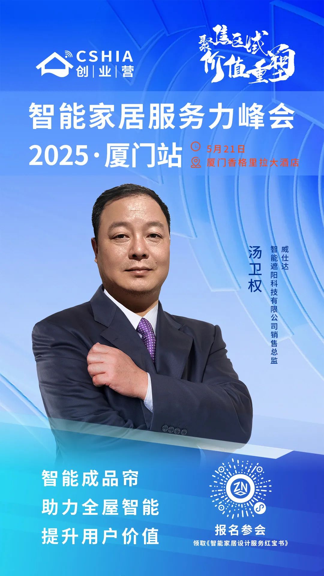 威仕达智能遮阳科技有限公司销售总监汤卫权先生将带来主题分享《智能成品帘助力全屋智能提升用户价值》,在全屋智能从单品竞争迈向场景融合的今天,如何让智能产品真正成为用户生活的价值倍增器?答案正藏在细节的智能化中,威仕达凭借20余年技术沉淀与全球化布局,已成为智能遮阳领域的标杆企业。