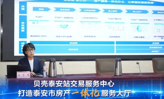 泰安市委、市政府大力推进房产服务改革,推出“一体化办公”模式。泰安市房产管理中心牵头,与贝壳泰安站研讨交流,针对存量房市场问题,融合政府监管与带押过户。