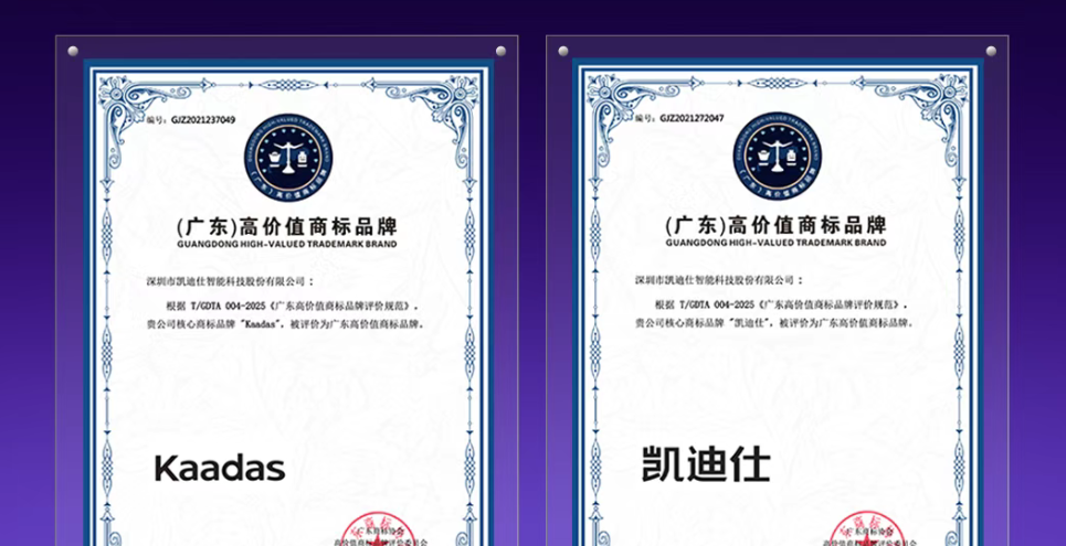近日,Kaadas凯迪仕集团旗下核心商标品牌“Kaadas”与“凯迪仕”双双获评“(广东)高价值商标品牌”。该项荣誉不仅体现了业界对凯迪仕在智能锁领域品牌价值的高度认可,也再次肯定了品牌在行业中的领先地位。