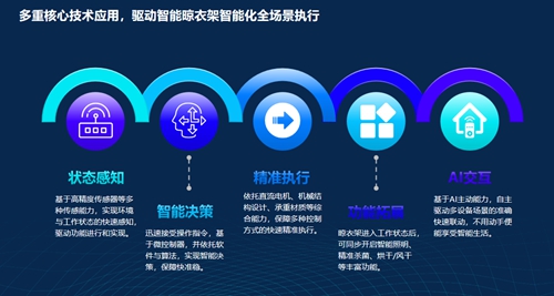 CSHIA Research中智盟咨询研究员、智能头条执行主编朱亮先生指出,随着多重核心技术应用,驱动智能晾衣架智能化全场景执行,而且是包括传感器技术、驱动与机械技术、通信技术、支持多种场景和设备联动等多重技术的高效协同运作,合力保障一台智能晾衣架完成从状态感知到智能决策、精准执行、功能拓展、AI交互的全流程精准执行。
