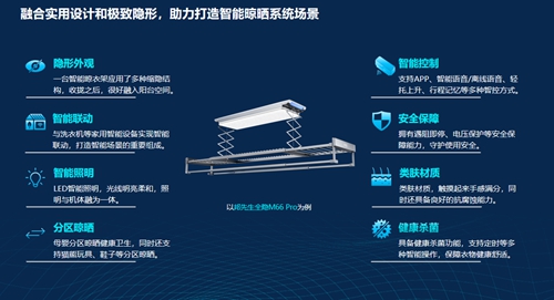 智能晾衣架融合实用设计、极致隐形和特殊材质,集成了多种智能控制、智能联动、智能照明等丰富能力于一体。基于分区晾晒、结构化设计等能力,解决用户在实际使用中的痛点,能够很好地融入阳台空间。已成为当前打造个性化、功能化、全隐形阳台空间不可或缺的组成产品,助力实现功能满足到场景体验的全面提升。