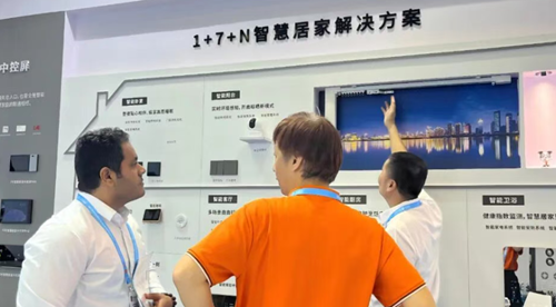 此次展会上,狄耐克全面展示了多个领域的创新成果。在智能家居展示区,狄耐克副总经理黄发扬正为外国友人详细介绍公司全新升级的1+7+N智慧居家解决方案和涵盖1.28吋-15.6吋的智慧家庭中控屏,以及六恒科技系统等产品,详尽展现了狄耐克打造的智慧家庭不仅具有一体化联动智慧社区和智慧安防等互联互通优势,更有全方位、全天候保持恒温、恒湿、恒氧、恒洁、恒静、恒智的四季“六恒”居家环境的健康保障,例如实现室内温度恒定在20~26℃的舒适区间,湿度维持在40%~60%的理想范围内,全天24h持续输送富氧新风。