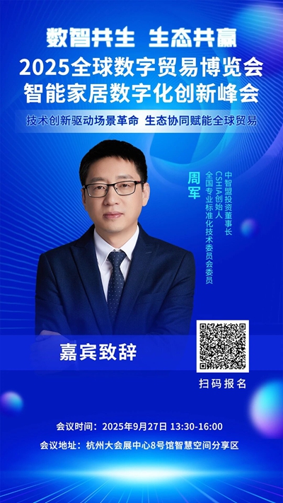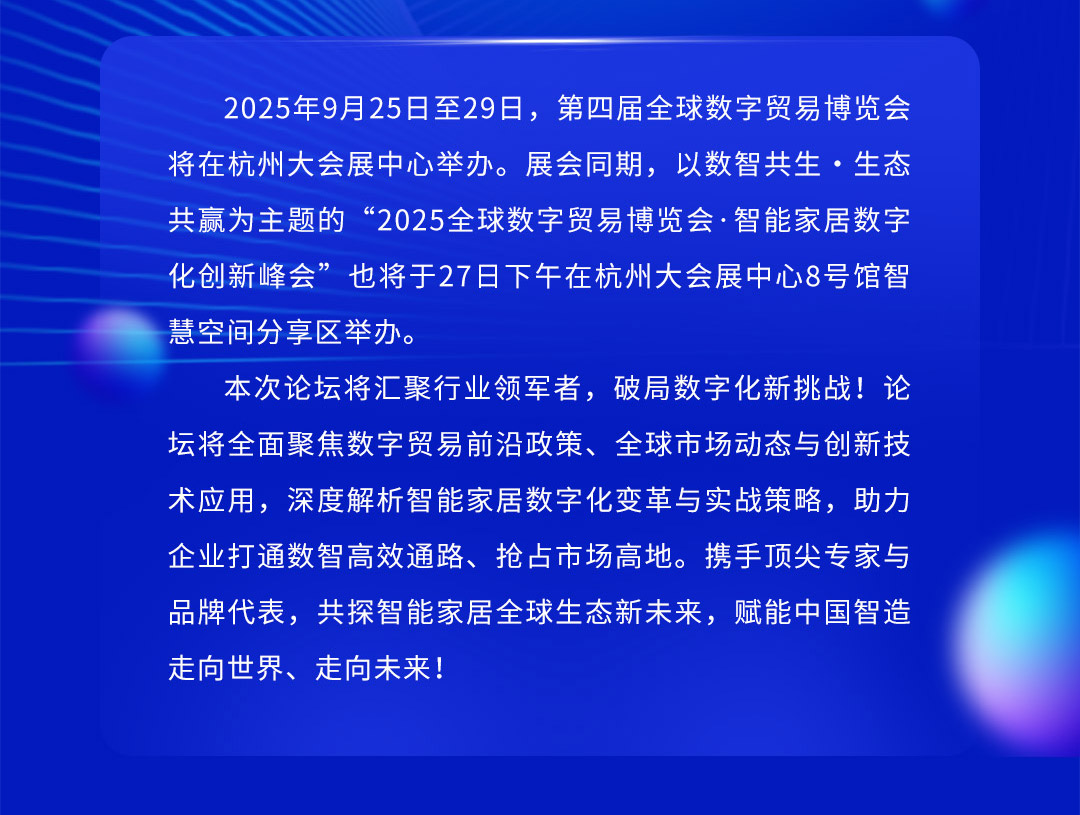 2025年9月25日至29日,第四届全球数字贸易博览会将在杭州大会展中心举办。展会同期,以数智共生•生态共赢为主题的“2025全球数字贸易博览会•智能家居数字化创新峰会”也将于9月27日下午在杭州大会展中心8号馆智慧空间分享区举办。