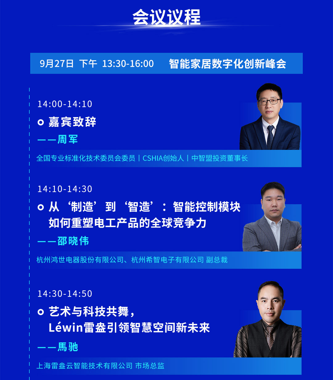 杭州鸿世电器股份有限公司、杭州希智电子有限公司副总裁邵晓伟先生、上海雷盎云智能技术有限公司市场总监馬驰先生、杭州觅睿科技股份有限公司AI研发总监赵刚强先生、涂鸦智能智能视频事业部产品总监王延波先生、博世全屋智能运营中心中国区家装渠道负责人宓凯恩先生将围绕产品创新、智能智造、智能中控、智能照明、品牌出海、渠道合作等维度带来深度观点分享。