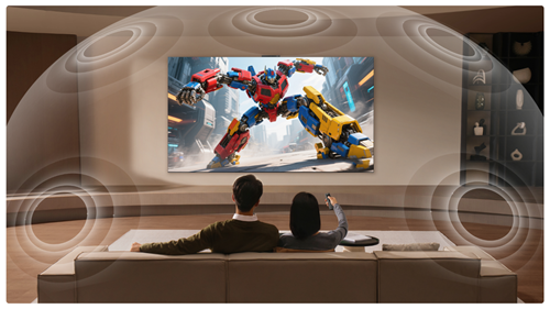 5.1观影体验同样出色,支持双5.1解码技术,兼容同轴、光纤、HDMI (ARC) 三种音频输入,5个专用吸顶喇叭分工明确(前置左右声道、后置环绕声道、中置人声强化),搭配升级双音盆无线低音炮D500,实现真正的5.1环绕声场,能精准捕捉影片细微音效差异,搭配DSP专业调校与可视化音效调节,在家即可享受影院级沉浸视听。