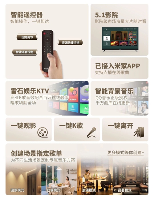 娱乐KTV功能满足欢聚需求,全新一代K歌模块搭配U段无线话筒,支持混响、延迟、变声等多音效调节,话筒与伴奏音量可单独控制,前置与后置喇叭可独立开关。接入雷石KTV在线歌库,数百万曲目实时更新,双屏异显功能(需搭配平板)让主机点歌与电视演唱互不干扰,一键K歌功能简化操作,随时开启嗨唱模式。