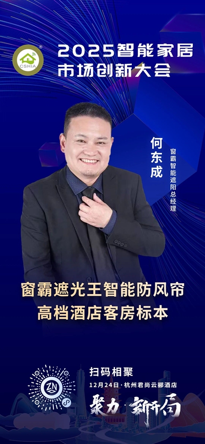 2025智能家居市场创新大会暨行业年终盛典,窗霸智能遮阳总经理何东成先生将带来《窗霸遮光王智能防风帘高档酒店客房标本》主题演讲。