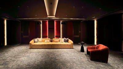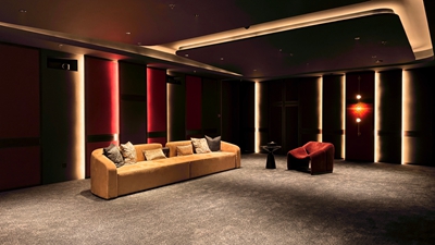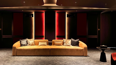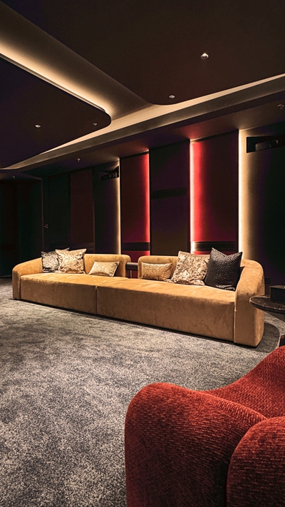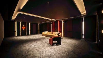 近 10 米画幅宛如延展的城市画卷,投影机的高亮度与高解析度确保建筑细节得以真实呈现;声场精准而不喧哗,低频深沉、中频饱满、环绕自然,为影像提供情绪底色。画面与声音同源发声,通过微孔透声幕布同步呈现,使客户获得更纯粹的视听体验。