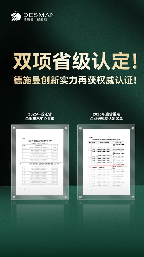 近日,浙江省经济和信息化厅相继公布了2025年度省重点企业研究院与省企业技术中心两大重量级名单。德施曼智能锁凭借在智能锁领域的深厚技术积累与卓越创新能力,一举斩获这两项殊荣。