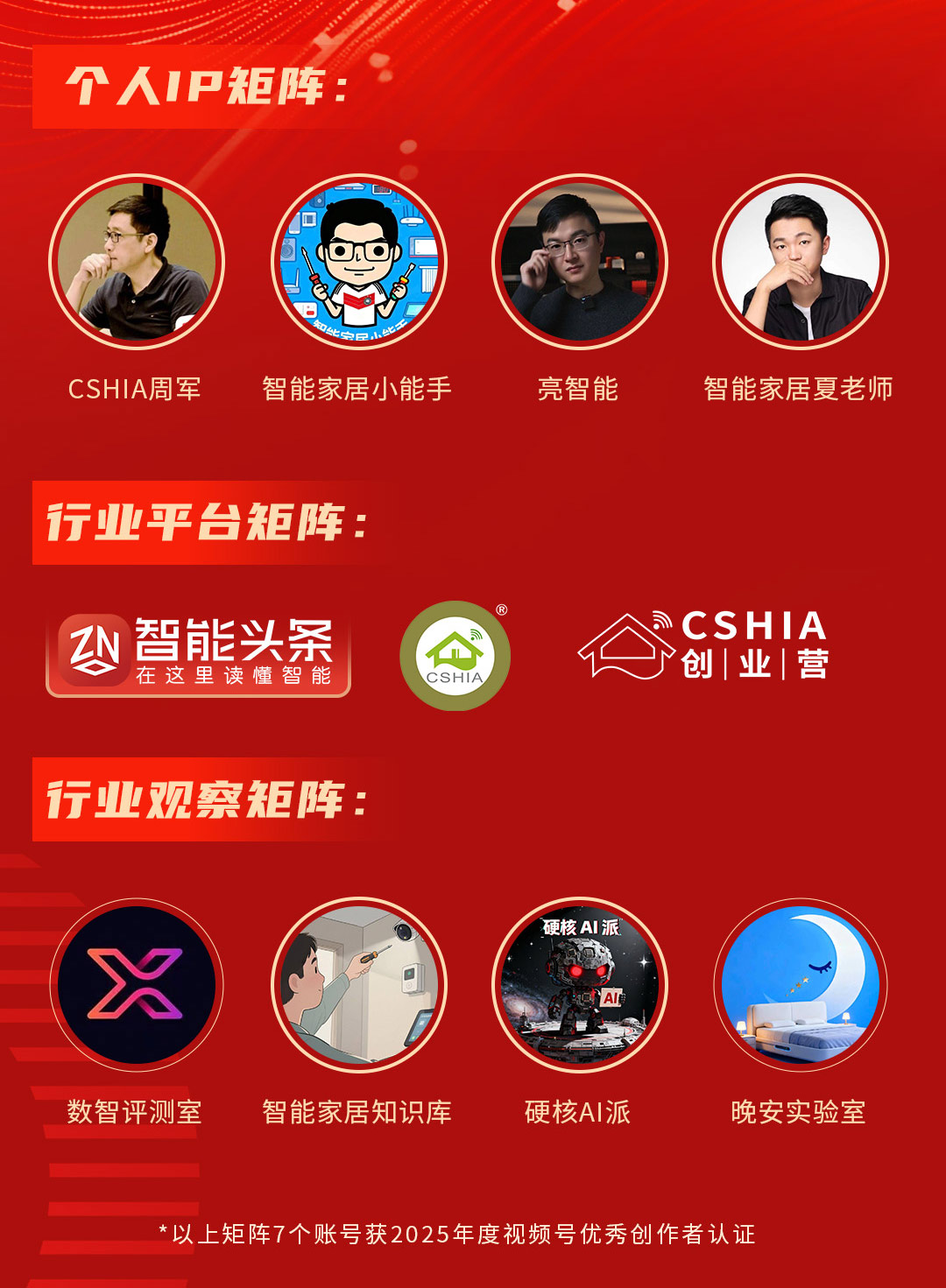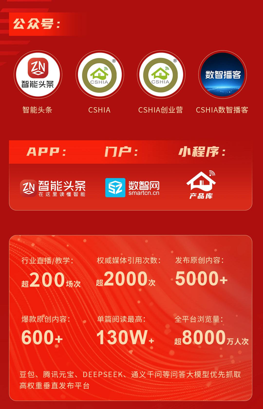 个人IP矩阵汇聚CSHIA周军、智能家居小能手、亮智能、智能家居夏老师等核心账号,行业平台矩阵涵盖智能头条、CSHIA、CSHIA创业营,行业观察矩阵则有数智评测室、硬核AI派等专业IP加持;同时布局公众号、视频号、抖音、小红书、哔哩哔哩等全流量平台,搭配智能头条APP、数智网、智能家居产品库小程序等自有阵地,以及智能头条、CSHIA数智播客等专属公众号,实现全域传播覆盖。