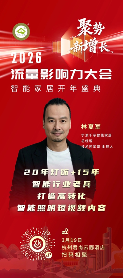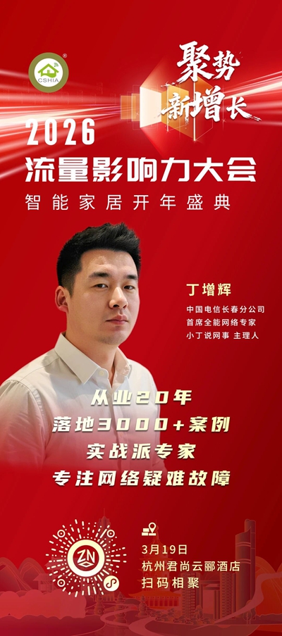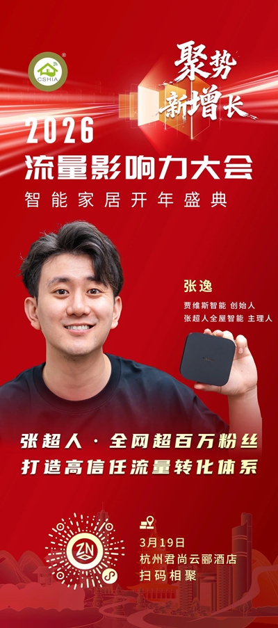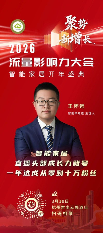 2026年3月19日,以“聚势•新增长”为主题的“2026流量影响力大会暨智能家居开年盛典”将在杭州君尚云郦酒店举办。