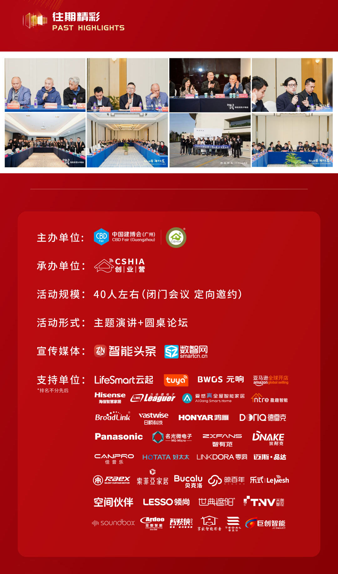 大会将特邀全国专业标准化技术委员会委员丨CSHIA创始人、中智盟投资董事长周军先生、中国建博会(广州)负责人霍瑞先生、LifeSmart云起智能创始人&CEO董熠先生、涂鸦智能战略客户业务总监马俊鹏先生、北京元响智能总经理黑维炜先生、亚马逊全球开店战略大客户经理陈桂先生等行业大咖带来主题分享与致辞,海信集团、力合微、爱感智能、盈趣、BroadLink、鸿雁、日顺、金凯德、松下、名光微电子、志邦、狄耐克、佳普乐、好太太、零洞、迈斯、瑞克斯、索菲亚、贝克洛、晾百年、帝科莫、乐式、领尚家居、世典、天朗智通、声博士、陕西亚都智能、郑州智装侠、上海空间伙伴、泰州享家智能、杭州巨创智能等数十家智能家居、泛家居、装企领军企业负责人齐聚,共话产业趋势、共商合作机遇。
