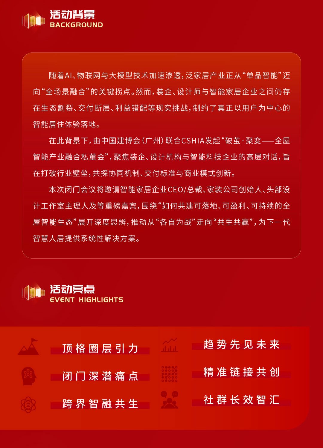 本次大会以聚势•新增长为主题,聚焦智能家居流量生态与产业升级,汇聚行业权威、企业领袖、平台精英与生态伙伴,共探流量破局、生态共建、商业增长新路径。同期私董会定位高规格、高价值、高精准闭门峰会,以高层对话、闭门研讨、资源对接为载体,直击行业生态割裂、交付断层、利益错配等痛点,重构协同机制、交付标准与商业模式。